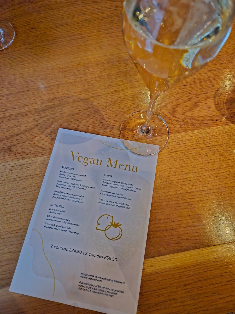 The menu showcases seasonal ingredients and culinary craftsmanship. From the tender Hereford beef fillet served with a rich bone marrow jus to the vegan roasted cauliflower steak elevated by harissa and tahini, there’s a clear commitment to quality and flavour balance. I particularly appreciated the Pan-Roasted Cod with crushed potatoes and samphire-it was cooked to perfection, flaky yet moist, and beautifully presented.